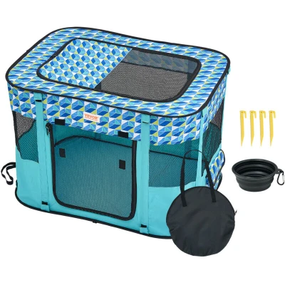 General description Our foldable pet playpen is perfect for providing a comfortable and safe space for your furry friends. Suitable for both indoor and outdoor use, it can be set up on your terrace, lawn, garden, or any room in your house. This portable dog playpen is ideal for camping and travel, ensuring your pets have a private area to relax. Technical specifications Item Model Number: SX5012 Product Size: 32 x 24 x 22 in / 812 x 609 x 558 mm Net Weight: 1.7 kg / 3.75 lbs Main Material: 600D Oxford Fabric Shape: Rectangle Folding Bowl (Dia.xH): 13 x 5 cm / 5.12 x 1.97 in Package Content 1 x Foldable Pet Playpen 1 x Folding Bowl 4 x Ground Anchors Usage Set up in seconds with no assembly required. Can be folded flat for easy portability and storage. Suitable for various pets including dogs and cats. Other information