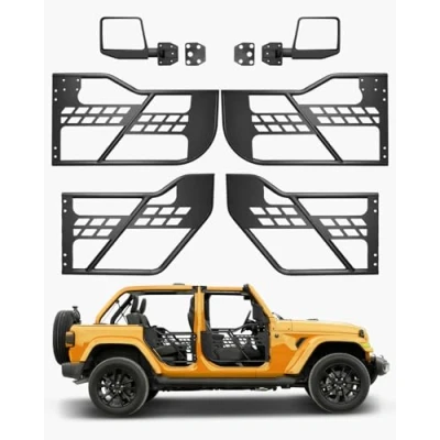 Compatibility: Designed for the 2018-2024 Jeep Wrangler JL & 2020-2024 Jeep Gladiator JT with a rugged hunting-style look, these tube doors fit both front and rear driver and passenger sides. The full set of four doors is built for off-road use only and is not intended as a security-restraint. Always wear your seatbelt and drive cautiously, avoiding sharp turns and sudden maneuvers. Side Mirrors Included: Equipped with DOT-certified side mirrors for enhanced rear visibility and securer lane changes. The mirrors install easily with secure fasteners, while rubber pads provide extra stability and minimize vibration noise on rough terrain. OE Latch with Rubber Pads: The jeep tube door’s heavy-duty latches ensure a secure fit with the factory door locking system for smooth operation. Upgraded thick rubber pads avoid scratches when opening and closing while lowering rattling noise on rough terrain and at high speeds. Easy Installation: Equipped with heavy-duty hinges, these jeep tube doors require no drilling or welding, allowing for a hassle-free installation onto factory door hinges. The included nylon limit straps avoid over-extension, lowering the risk of collisions. Heavy-Duty Steel Construction: Built with reinforced steel tubing and finished with an electrophoretic and textured coating, these doors provide exceptional durability and corrosion-resistance. Ready to withstand sand, rocks, and rain, they are your trusted companion for outdoor adventures.