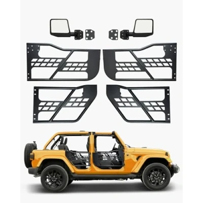 Compatibility: Designed for the 2007-2018 Jeep Wrangler JK with a rugged hunting-style look, these tube doors fit both front and rear driver and passenger sides. The full set of four doors is built for off-road use only and is not intended as a security-restraint. Always wear your seatbelt and drive cautiously, avoiding sharp turns and sudden maneuvers. Side Mirrors Included: Equipped with DOT-certified side mirrors for enhanced rear visibility and securer lane changes. The mirrors install easily with secure fasteners, while rubber pads provide extra stability and minimize vibration noise on rough terrain. OE Latch with Rubber Pads: The jeep tube door’s heavy-duty latches ensure a secure fit with the factory door locking system for smooth operation. Upgraded thick rubber pads avoid scratches when opening and closing while lowering rattling noise on rough terrain and at high speeds. Easy Installation: Equipped with heavy-duty hinges, these jeep tube doors require no drilling or welding, allowing for a hassle-free installation onto factory door hinges. The included nylon limit straps avoid over-extension, lowering the risk of collisions. Heavy-Duty Steel Construction: Built with reinforced steel tubing and finished with an electrophoretic and textured coating, these doors provide exceptional durability and corrosion-resistance. Ready to withstand sand, rocks, and rain, they are your trusted companion for outdoor adventures.