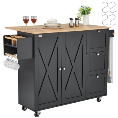 VEVOR Kitchen Island Cart, 45.3" Wood Top Mobile Carts with Storage Cabinet, Rolling Table Drop Leaf, Spice Rack, Towel Bar, Adjustable Shelf, Drawer, and Hooks, Portable Islands on Wheels, Black