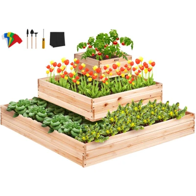 General description The VEVOR Raised Garden Bed is designed to enhance your gardening experience, allowing you to grow flowers, vegetables, and herbs in your backyard, garden, patio, or balcony. Made from high-quality fir wood, this sturdy planter box ensures long-lasting use while providing excellent drainage with its open base, promoting healthy plant growth. Technical specifications Product Size: 44.5 x 44.5 x 20.1 inch / 113 x 113 x 51 cm Net Weight: 25.1 lbs / 11.4 kg Material: Fir Wood Color: Burlywood Compatibility and accessories 1 x Raised Garden Bed 10 x Plant Labels 1 x Non-woven Pad 1 x Planting Tool Set (2 x Shovel, 1 x Rake) 1 x Screw Driver 1 x User Manual Installation The raised garden bed features a dovetail insertion design for quick and effortless installation. Simply connect the wooden boards without the need for tools, making it suitable for novices who enjoy gardening. Usage This garden bed is perfect for growing a variety of plants, including vegetables, fruits,