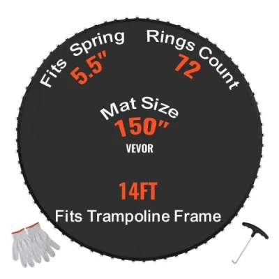 VEVOR Replacement Trampoline Mat, Jumping Mat Fits 14ft Frame, Universal Jumping Mat for 14ft Round Trampoline, Reinforce UV-Resistant Mat with Spring Tool & Durable V-Rings, Fit 5.5" Spring LengthFits Trampoline SizeHigh-Strength Flexible MaterialHow to MeasureEasy InstallationVersatile ApplicationSafer and StrongerFits Spring Length: 5.5 inch / 14 cm,Jumping Mat Diameter: 150 inch / 381 cm,Item Model Number: SDKC202406YY28CGQ,Product Weight: 10.5 lbs / 4.8 kg,Fits Trampoline Frame Outer Diameter: 14 ft / 426 cm,Jumping Net Material: PP
