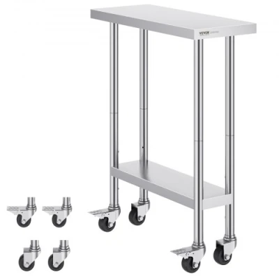 VEVOR Stainless Steel Work Table 30 x 12 x 38 Inch, with 4 Wheels, 3 Adjustable Height Levels, Heavy Duty Food Prep Worktable for Commercial Kitchen Restaurant, SilverStylish Work TableMultiple Styles AvailableDurable and StableFlexible SetupEasy to InstallVersatile ApplicationsHeight Adjustment: 3 Levels,Product Size (L x W x H): 30 x 12 x 38 inch / 762 x 305 x 954.6 mm,Item Model Number: HETG-30*12,Product Weight: 21 lbs / 9.6 kg,Material: Stainless Steel