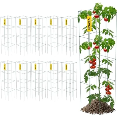 10 Packs 3-tier Trellis: 10 sets of 3-tier square trellis. 46.1"/ 117 cm high tomato cage is specifically designed to provide vertical climbing plants support, preventing the fruit, vegetable, and leaves from weighing down the stems or entangling with each other. The large 11.8"L x 11.8"W/ 30 x 30 cm openings square frame gives your plants more space to branch out, accessing for a bigger, cleaner harvest at growing seasons. Multi-function Tomato Cages: With the help of our folding tomato cage, your climbing plant will not be blown over by the wind or drooping due to the fruits coming in crowds. Besides, the cage can also keep fruits off the ground to avoid rot and animal damage. Perfect for the growth of tomato plants, eggplants, peppers, peas, beans, zucchini, strawberries, raspberries, cucumbers, climbing flowers, etc. Strong Support Steel Wire: φ0.2"/ 4 mm solid steel core wire structure with well-welding technology provides the growing plants with durable and sturdy support. Up to 22 lbs/ 10 kg load capacity tomato cage stands firmly even with heavy fruits. With a PVC coating, the large tomato cages will be no rust or corrosion after years of usage. The green surface helps to blend into plants, natural without seeming weird. Foldable & Flexible Combination: The heavy-duty tomato cage can be easily interlocked with the lock on the side, and it can be folded flat into the 1/4 width of each unfolded trellis for off-season compact storage. DIY assemble the folding plant support into different shapes --irregular, half-folded, tiled, and triangle-- to maximally utilize the space of your garden. Installation Kit for Application: No tool is needed to install, only to insert the four steel stakes into the ground. 10"/ 26 cm high in-ground legs can be adjusted to meet your needs. Our tomato tower is excellent for indoor and outdoor applications. Suitable for the fruits, vegetables, and flowers planted on the garden, home, balcony, roof, and courtyard.