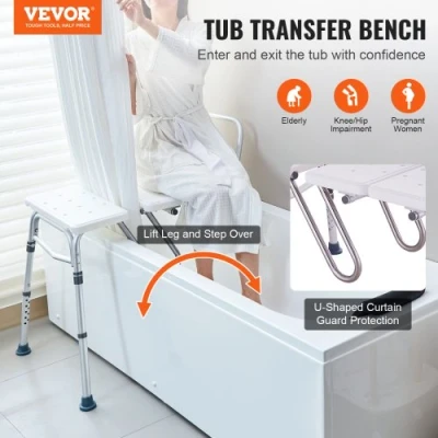 VEVOR Tub Transfer Bench, Adjustable Bathtub Transfer Bench with U-Shaped Curtain Guard Protection & Reversible Backrest, Non-Slip Shower Seat Bath Bench for Elderly Disabled Injured, 400LBS CapacityAdjustable HeightHigh Weight CapacityComfortable SeatEasy InstallationStrong StabilityVersatile Bath AssistantAt Lowest Level: 34.6 x 22.0 x 31.9 in / 880 x 560 x 810 mm,Height Adjustment: 10 Levels (0.5 in / 12.7mm Per Level),Backrest Dimensions: 16.5 x 7.1 in / 420 x 180 mm,Seat Plate Dimensions: 28.9 x 16.1 x 1.4 in / 735 x 410 x 35 mm,Item Model Number: FBL630238,Maximum Load Capacity: 400 lbs / 180 kg,Product Weight: 13.7 lbs / 6.2 kg,At Highest Level: 36.2 x 24.0 x 36.4 in / 920 x 610 x 925 mm,Product Dimensions:,Main Material: Aluminum Alloy, HDPE,Seat Plate Height: 18.1 - 22.4 in / 460 - 570 mm