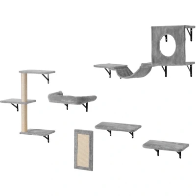 General description This VEVOR Wall Mounted Cat Shelves set includes a variety of components designed to create a fun and engaging environment for your cat. It features 2 jumping boards, 1 hammock, 1 sofa, 1 cat tree, and 1 cat grip, catering to your cat’s needs for climbing, playing, resting, and scratching. Technical specifications Maximum weight capacity: 40 lbs (18.14 kg) Material: Particle board with a metal frame Surface: Plush pad for slip-resistance and softness Installation Includes all necessary accessories and an installation guide Installation process: Insert expansion tubes into the wall and secure the boards using screws Designed for easy setup by one person Usage Can be arranged freely to suit different spaces and preferences Ideal for installation in living rooms, bedrooms, or patio walls Blends well with home decor while saving floor space Other information