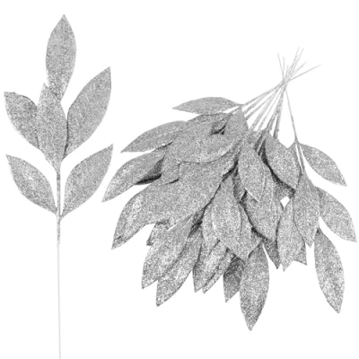 VEYLIN Christmas Glitter Bay Leaf, 12Pcs Artificial Tree Picks Sprays for Wreath Floral Wedding Bouquet Decoration(Silver)