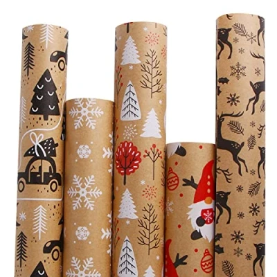 Package: You will get 5 rolls of brown gift wrapping paper with 5 classic Christmas pattern designs, perfect for Christmas gift, present boxes, parcel and festival decoration Size: The Christmas wrapping paper rolls approx 43.2cm/17inch wide x 3m/9.8ft long, totally 15m/49.2ft long, suitable for packing gifts of many sizes Material: These brown wrapping paper are made of premium Kraft paper material, durable and recyclable, non-toxic and tasteless, which is truly a green choice. Not easy to tear Classic Christmas Design: The present packing paper has an elaborate Christmas design on it, like Christmas tree, snowflakes, cars, Santa Claus, reindeer etc, which gives you more choices. You can choose the pattern you like to wrap the gifts Features: There is a grid cutting line on the reverse side, which is convenient for cutting when wrapping gifts. You can choose paper you like to wrapping your all kinds of Xmas presents, boxes, parcels, gift cards and festival decoration etc
