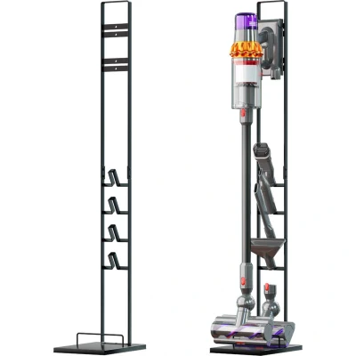 AmazonHigh-quality upright storage organiser for cordless vacuum cleaner & accessories or attachments e.g. docking station, brushes, nozzles, etc. Comfortable storage for more tidiness at home | Keep all your cleaning equipment in one place | Device can be charged even when on the stand Stable, weighted base plate so storage rack remains vertically in place | 4 rubber feet for extra floor protection | Simple design | Portable Freestanding - no drilling necessary | Colour: dark grey | Size: 22 x 29 x 127 cm | Material: aluminium | Weight: 3750 g | Sturdy & space-saving 1x floor stand, assembly material & tools | Easy installation & instant organisation | Vacuum cleaner accessories & spare parts