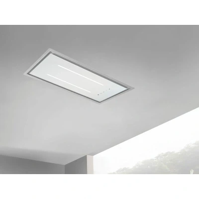 General description This slimline ceiling hood is designed for a flush fit between standard joists, providing a sleek and modern look for your kitchen. It features a central white hinged glass panel that conceals washable stainless steel grease filters, along with changeable colour mood LED lighting and a brushed stainless steel outer frame. The attractive Bluetooth remote control allows for easy operation, while manual touch controls are also available. Technical specifications Dimensions: L 900 x D 320 mm x H 207 mm Motor rating: 600 m³/hr Hood extraction rate: 411.1 m³/hr Maximum height above hob: 1.6 m Noise level: 54 - 59 dB Weight: 15.3 kg Installation Minimum height for installation: 75 cm (gas) / 65 cm (electric) Requires 220 x 90 mm rectangular ducting for installation Can be converted to 150 mm round ducting for draughtproof or insulated systems Fits between joists with a minimum height of 203 mm plus 12.5 mm plasterboard (total 215.5 mm) For tight installations, additional