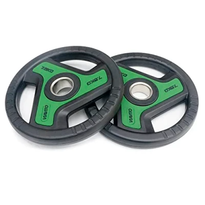 SweatbandMade to absorb shock, reduce noise, and protect your floor and equipment, the Viavito rubber bumper Olympic weight plates allow for safe and effective strength training and weightlifting sessions. Featuring a heavy-duty, durable SBR rubber construction, they are resistant to cold and moisture and perfect for indoor and outdoor use. To make the plates easy to pick up and allow for free weight exercises, there is a practical tri-grip design. The weight plates are sized accordingly to the IWF (International Weightlifting Federation) standard and compatible with Olympic (2') barbells. They ensure a minimal bounce and have a tough and durable solid steel centre hole. An embossed logo, weight mark and colour-coded detailing guarantee quick and easy identification.