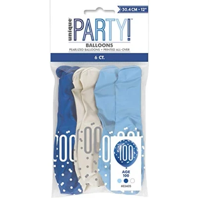 BOLD & BEAUTIFUL COLORS: Our vibrant 100th glitz latex balloons come in a dazzling mix of light blue, royal blue, and white, perfect for adding a pop of color and elegance to any milestone event or celebration. HIGH-QUALITY LATEX MATERIAL: Crafted with premium quality latex, these balloons are durable, eco-friendly, and ensure maximum safety for your party-goers and the environment. PERFECT FOR ANY CELEBRATION: These versatile balloons are ideal for parties, anniversaries, milestone events, or any festivity calling for a touch of colorful elegance to elevate your decorations. EFFORTLESS INFLATION: Easy-to-inflate design allows for quick and hassle-free set-up, whether you're using a balloon pump or simply your own breath, giving you more time to enjoy the party. QUANTITY & SIZE GUARANTEED: With 6 stunning 30cm balloons in each pack, you'll have enough to create beautiful balloon arrangements and table centerpieces, making your special occasion truly unforgettable., Manufacturer: Unique