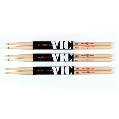 Bundle pack (3 pairs of sticks) of the popular Vic Firth American Classic 5A drum sticks made in the USA from American Hickory. All pairs are matched through computer analysis for optimum balance of weight and pitch The 5A sticks are the most popular Vic Firth sticks and are great for every style of music - the 'go to' pair The 5A sticks have a lacquer surface and medium taper Wood Tip: Tear Drop Dimensions: Length = 16" | 40.64cm Diameter = .565" | 1.44cm