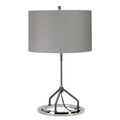 Available in two different finishes, this modern table lamp is sure to provide a clean and clear feel to its surroundings. The fitting has a polished nickel ring base, with three feel arranged pyramid style upon which the stem sits. Atop the stem is the round shade in white or grey. This fitting is the ideal choice for any modern setting, where it is sure to provide the perfect additional light.