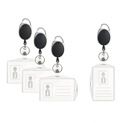 【Two-Sided ID Cards】This New design credit card holder has vertical and horizontal holes on both sides.Card size: same as credit card size. 【Premium Quality】The badge reels made of high quality rigid plastic and zinc alloy, are not easy to crack and highly resistant to falling(8mm thick). 【Easy and convenient】Each badge reel has keychain and plastic buckle, It is so easy to clip your badge and ID card set.The Strong cord extends up to approx.68.5 cm that allow you to use your badge without bending down. 【Good Fastening】Our set of retractable reels can hold one card, and keep your card visible, clean and secure.The D-shaped climbing hook and clip on the back is easy to fasten hang.you can use it with the clip on belt buckles, lanyards, backpacks and other portable bags. 【Application】Suitable for school staff, office workers, police and fire departments, maintenance workers, and security guards, nurse, etc. Warm tips: Our products are made of transparent plastic and there may be some scratches on the surface due to the special injection molding process. It will not affect normal use.Hope you could kindly understand.Any question, please feel free to contact us.Thanks.