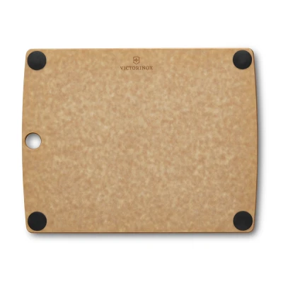All-in-one chopping board: whether for cakes, meat or vegetables, this chopping board is ideal for cutting, chopping, preparing and serving all types of food, The juice groove collects excess liquids and prevents smearing on the work surface Comfort: the chopping board has four removable rubber feet at the corners, which ensure a secure stand and a comfortable height, The feet are easy to remove and clean Durable and easy to care for: the chopping board is made from a robust and environmentally friendly paper composite that is heat-resistant up to 175 °C, The material is dishwasher-safe and gentle on knife blades Product details: 292 mm length, 228 mm width, 6 mm height, 454 g weight, light brown colour, article no. 7.4125, All-in-One chopping board, size S HIGHEST SWISS QUALITY: Victorinox stands for skilled craftsmanship and innovative design. We draw on 140 years’ experience and produce iconic, high-quality knives, watches and travel gear