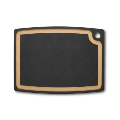 Gourmet series chopping board: whether for cakes, meat or vegetables, this chopping board is ideal for cutting, chopping, preparing and serving all types of food Practical and elegant: thanks to the juice groove, the work surface remains clean and dry, even when you are cutting juicy food, The chopping board impresses with its stylish two-colour design Durable and easy to care for: the chopping board is made from a robust and environmentally friendly paper composite that is heat-resistant up to 175 °C, The material is dishwasher-safe and gentle on knife blades Product details: 445 mm length, 330 mm width, 9 mm height, 1633 g weight, black colour, article no. 7.4129.3, Gourmet series chopping board, size L HIGHEST SWISS QUALITY: Victorinox stands for skilled craftsmanship and innovative design. We draw on 140 years’ experience and produce iconic, high-quality knives, watches and travel gear