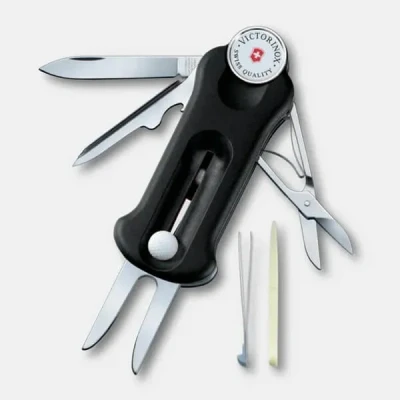 Amazon MarketplaceGOLFTOOL: Sport Tool with 10 Functions for Golfers - 10 functions. Removable ball marker FUNCTIONS: Ballmarker and repair tool. Blade large, Scissors, Repair tool, Ballmarker, Tee punch, Bottle opener, Nail file, Groove cleaner, Tweezers, Toothpick FIT FOR ALL TASKS: Indispensable for outdoor tasks of all kinds and for a creative, adventurous lifestyle. The robust knives have a non-slip, ergonomically shaped handle and a reliable locking blade for optimum stability PRODUCT DETAILS: Length 91 mm, Width 36.5 mm, Height 16.5 mm, Weight 64 g, Scale material Polyamide, Color Black, Sharpened blade length 59 mm, Item 0.7052.3, GolfTool HIGHEST SWISS QUALITY: Victorinox stands for skilled craftsmanship and innovative design. We draw on 140 years’ experience and produce iconic, high-quality knives, watches and travel gear