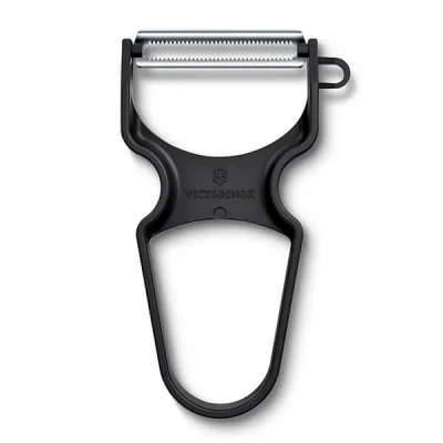 Harts of SturUpgrade your prep game with the Victorinox Rapid Black Serrated Peeler – a sleek, modern take on the iconic Swiss Rex peeler. Designed for effortless peeling and maximum comfort, it features an ultra-sharp, double-edged serrated blade that grips and glides through even the most delicate skins with ease.Crafted for both left- and right-handed users, this peeler combines a lightweight yet durable black ABS plastic handle with a lateral potato eye remover for added versatility. Whether you're working with tomatoes, apples, or root vegetables, it delivers fast, precise results with minimal waste.Dimensions: 11cm (L) x 6.5cm (W) x 1.2cm (H). Weight: 0.013kg.Dishwasher safe for easy cleaning.Covered by a Victorinox lifetime guarantee.