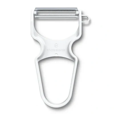 Harts of SturPeel like a pro with the Victorinox Rapid White Serrated Peeler, designed for fast, efficient kitchen prep with minimal waste. Building on the iconic Swiss-made Rex peeler, the Rapid model combines sleek functionality with modern ergonomics – perfect for left- or right-handed use.Its razor-sharp, double-edged serrated blade glides through soft and firm produce alike, making light work of everything from tomatoes and kiwis to carrots and potatoes. A handy lateral potato eye remover adds extra practicality, while the lightweight ABS handle offers a secure, comfortable grip.Dimensions: 11cm (L) x 6.5cm (W) x 1.2cm (H). Weight: 0.013kg.Dishwasher safe for easy cleaning and supplied with a reassuring Victorinox lifetime guarantee.