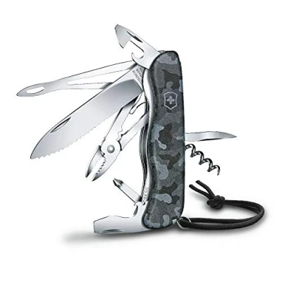 SKIPPER: Large Pocket Knife for Sailing - Your perfect pocket tool for stripping wire and opening cans on your sailing expeditions. Includes a lanyard, plus shackle opener with marlin spike FUNCTIONS: Swiss made pocket knife with 18 functions, includes Blade large with wavy edge, Corkscrew, Can opener, Bottle opener lockable, Phillips screwdriver 1/2, Combination pliers, Wire cutters, Wire crimper, Shackle opener, Marlin spike FIT FOR ALL TASKS: Indispensable for outdoor tasks of all kinds and for a creative, adventurous lifestyle. The robust knives have a non-slip, ergonomically shaped handle and a reliable locking blade for optimum stability PRODUCT DETAILS: Length 111 mm, Width 35 mm, Height 23 mm, Weight 181 g, Scale material Polyamide, Color navy camouflage, Sharpened blade length 79 mm, Item 0.8593.W942, Skipper HIGHEST SWISS QUALITY: Victorinox stands for skilled craftsmanship and innovative design. We draw on 140 years’ experience and produce iconic, high-quality knives, watches and travel gear