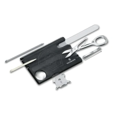 SWISSCARD NAILCARE: The Swiss Card with Glass Nail File - Recipient of the Red Dot Award: Product Design 2015. Includes resistant glass nail file and scissors FUNCTIONS: Swiss made functional companion with 13 functions. Screwdriver 3 mm, Screwdriver 5 mm, Scissors, Glass nail file, Phillips screwdriver 00/0, Phillips screwdriver 1/2, Magnifying glass, Ruler (cm), Ruler (in), Pin, Tweezers, Toothpick, Ballpoint pen EVERYDAY COMPANION: Compact, agile, and colorful, this Swiss-made stainless steel multi-tool fits in your wallet alongside credit cards. With limitless possibilities, it's a sleek and sturdy companion for any adventure PRODUCT DETAILS: Length 82 mm, Width 55 mm, Height 4.5 mm, Weight 26 g, Scale material ABS/Cellidor, Color Black Translucent, Sharpened blade length 36 mm, Item 0.7240.T3, SwissCard Nailcare HIGHEST SWISS QUALITY: Victorinox stands for skilled craftsmanship and innovative design. We draw on 140 years’ experience and produce iconic, high-quality knives, watches and travel gear