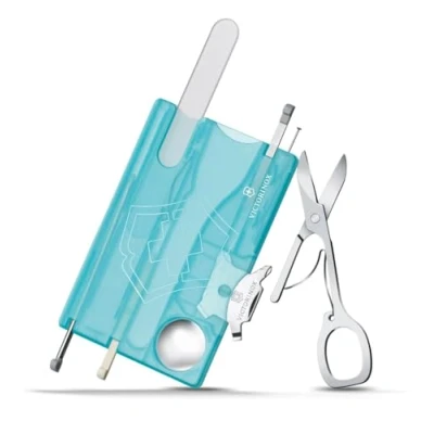 SWISSCARD NAILCARE: The Swiss Card with Glass Nail File - Recipient of the Red Dot Award: Product Design 2015. Includes resistant glass nail file and scissors FUNCTIONS: Swiss made functional companion with 13 functions. Screwdriver 3 mm, Screwdriver 5 mm, Scissors, Glass nail file, Phillips screwdriver 00/0, Phillips screwdriver 1/2, Magnifying glass, Ruler (cm), Ruler (in), Pin, Tweezers, Toothpick, Ballpoint pen EVERYDAY COMPANION: Compact, agile, and colorful, this Swiss-made stainless steel multi-tool fits in your wallet alongside credit cards. With limitless possibilities, it's a sleek and sturdy companion for any adventure PRODUCT DETAILS: Length 230 mm, Width 120 mm, Height 6.5 mm, Weight 49 g, Scale material ABS/Cellidor, Color Ice Blue Translucent, Sharpened blade length 36 mm, Item 0.7240.T21B1, SwissCard Nailcare HIGHEST SWISS QUALITY: Victorinox stands for skilled craftsmanship and innovative design. We draw on 140 years’ experience and produce iconic, high-quality knives, watches and travel gear
