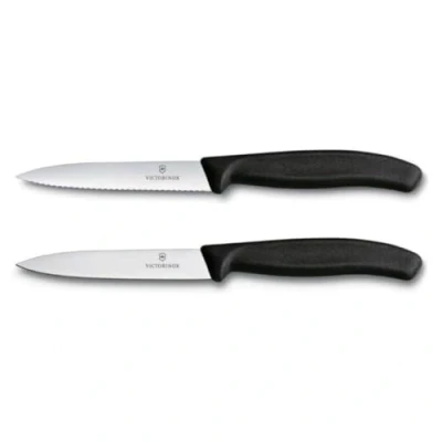 Bring precision and versatility to your prep work with the Victorinox Swiss Classic Black 2-Piece Paring Knife Set. This essential duo includes one ultra-sharp straight blade and one finely serrated edge, perfect for everything from peeling and trimming to slicing tomatoes or citrus with ease.Designed with lightweight, ergonomic black handles for comfort and control. This set includes 1 straight-edge and 1 serrated 10cm paring knife.Dimensions: 21.1cm (L) x 2.3cm (W) x 1.2cm (H). Blade length: 10cm. Weight: 0.027kg per knife.Dishwasher safe, though hand washing recommended.Made in Switzerland and covered by a Victorinox lifetime guarantee.  Knives are not for sale to persons under the age of 18. - all knives and bladed products are delivered by Age Verified Delivery (AVD). The carrier may request proof of age in order to deliver your parcel. If proof of age is not available, or the recipient is underage, the carrier will refuse to deliver.
