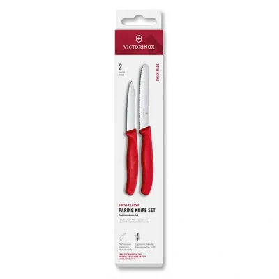 Kitchen KnivesSet Includes:1 Straight-Edge Paring Knife – ideal for clean, controlled cuts1 Wavy-Edge (Serrated) Paring Knife – perfect for foods with firm skins and soft interiors (e.g. tomatoes, kiwis)Key Features:Professional Sharpness: Blades are made from high-quality stainless steel, designed for long-lasting sharpness and performance.Lightweight & Ergonomic Handles: Bright red synthetic handles are shaped for comfort and control, even during longer prep sessions.Swiss Made: Crafted to the renowned standards of Victorinox, ensuring quality and durability.Best For:Everyday prep work: fruits, vegetables, herbs, and moreCompact knife setups, student kitchens, or as a gift setCooks who want versatility in just two knives