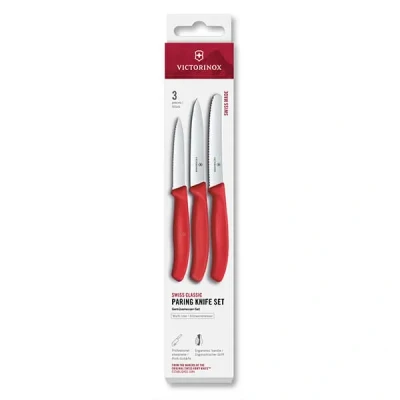 Add a pop of colour to your kitchen with the Victorinox Swiss Classic 3-Piece Paring Knife Set in vibrant red. This essential set includes: 8cm Serrated Paring Knife - Ideal for effortlessly slicing through soft fruits and vegetables. 10cm Straight-Edge Paring Knife - Perfect for precise peeling and intricate cutting tasks. 11cm Serrated Tomato & Table Knife - Designed to glide through tomatoes, bread, and more with ease.Each knife boasts an ergonomic red polypropylene handle, offering comfort and control during use. The stainless steel blades ensure long-lasting sharpness and reliability.Dimensions -Serrated Paring Knife: 18.9cm (L) x 2cm (W) x 1.1cm (H). Blade length: 8cm. Weight: 0.020kg.Straight-Edge Paring Knife: 21.1cm (L) x 2.3cm (W) x 1.2cm (H). Blade length: 10cm. Weight: 0.027kg.Tomato & Table Knife: 22cm (L) x 2.4cm (W) x 1.2cm (H). Blade length: 11cm. Weight: 0.028kg.Dishwasher safe, though hand washing is recommended.Swiss-made and comes with a manufacturer's lifetime guarantee.  Knives are not for sale to persons under the age of 18. - all knives and bladed products are delivered by Age Verified Delivery (AVD). The carrier may request proof of age in order to deliver your parcel. If proof of age is not available, or the recipient is underage, the carrier will refuse to deliver.