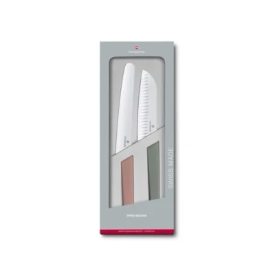 Kitchen KnivesFrom tarts, cakes and shortcrust pastry pies through to oversized vegetables, finer meat cuts and even delicate sushi slices. Add this duo to your kitchen arsenal for failsafe reliability.Bread Knife - A large serrated knife that is great for slicing foods with thick crusts or rinds like artisan breads and melons/gourds. It also cuts through soft bread without crushing it.An alternative to the chef's knife. Great for cutting, chopping and mincing vegetables. The blade has a straighter edge than a chef's knife and has a blunted sheepsfoot-tip blade with a thinner spine. It can easily slice thin-boned and boneless meats, fish and vegetables.The ideal duo for slicing, dicing and cutting through it all; from quiches and loaves to all kinds of vegetables, fruit and herbsSwiss made bread and pastry knife and Santoku knifeStainless, wear-resistant steel prongs and synthetic handleThe set includes:Swiss Modern Colour 22cm Bread & Pastry KnifeSwiss Modern Colour 17cm Santoku Knife with fluted edge