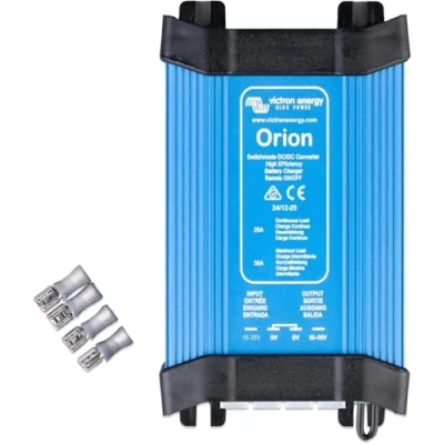 Victron Energy Orion Non-isolated DC-DC Converter converts voltage from DC 24-Volt (18-Volt - 35-Volt) to DC 12-Volt (10-Volt - 15-Volt) with a 25 amp output and 96% high conversion efficiency The remote on-off connector eliminates the need for a high current switch in the input wiring, the remote on-off can be operated with a low power switch or by the engine run/stop switch All models with adjustable output can also be used as a battery charger - For example to charge a 12 Volt starter or accessory battery in an otherwise 24V system. All models with adjustable output can be paralleled to increase output current - Up to five units can be connected in parallel. Easy to install and Widely used in motor, marine, electronic systems, dashcam, car, boat, RV, truck, golf cart, LCD TV, advertising screen, led strip light, monitoring system, solar pad and more