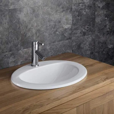The Vida White Ceramic Oval Basin boasts an easy "drop-in" installation and a self-rimming design, adding elegance to any bathroom decor. Measuring 520mm in width and 460mm in depth, it fits comfortably above a countertop, offering spacious dimensions for daily tasks like washing and shaving. The basin includes an internal overflow at the front, preventing water overflow while maintaining a seamless look. Made from high-quality gloss white ceramic, it features a minimalist oval shape that complements various bathroom styles. Designed with a 95mm tap ledge and one tap hole, it accommodates slotted wastes. Its dimensions are 210mm in height, 520mm in width, and 460mm in depth externally, with internal dimensions of 180mm in height, 400mm in width, and 290mm in depth. This family-sized basin offers a chic, functional addition to modern bathroom settings.. Vida 520mm x 430mm White Ceramic Oval Basin Clickbasin
