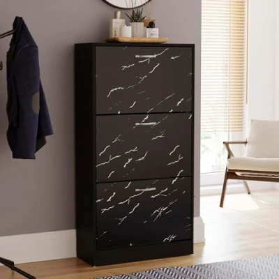Vida Designs 3 Drawer Shoe Cabinet Cupboard Storage Organiser Pull Down Wooden Furniture Unit (Black Marble)