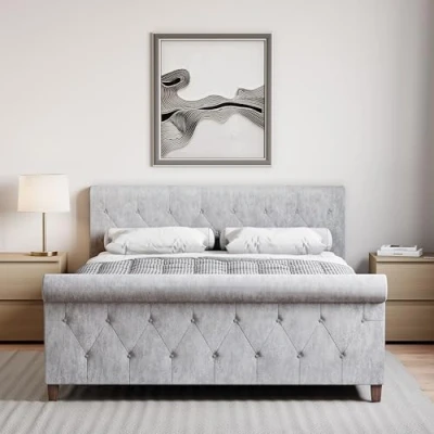 Luxurious Crushed Velvet: Upholstered in soft, crushed velvet, providing a lavish and elegant look that enhances your bedroom decor. Unique Design: A distinctive and stylish design that stands out as a statement piece in your bedroom. Modern Feet: The sleek and stylish feet offer an elevated, contemporary look, adding to the bed’s sophisticated aesthetic. Sturdy Construction: Built with high-quality materials to ensure long-lasting durability and support for a comfortable sleep experience. Easy to Assemble: Simple assembly process, so you can quickly enjoy your new bed frame without hassle.