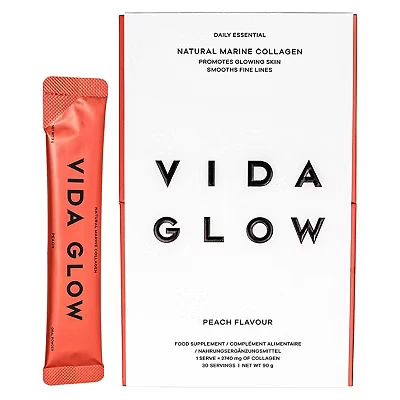 Bioavailable Hydrolysed Marine Collagen Peptides – Vida Glow Marine Collagen is made from sustainably-sourced fish skin, and has been activated to boost absorption and stimulate fresh collagen production. Collagen Health Benefits - Integrated into your daily routine, our Natural Marine Collagen helps to; reduce the appearance of fine lines and wrinkles, firm and plump the skin, improve skin elasticity, and promote healthy hair & nail growth. Easy to use – Our Marine Collagen powder is measured into 3g single dosage sachets, and can be easily dissolved in hot or cold liquids. 1-3 sachets can be taken each day in the morning, afternoon, or evening. Peach Flavored Collagen Powder – Our Blueberry Marine Collagen formula is infused with real peaches, adding a subtly sweet, fresh flavour, that you can easily add to your favourite drink. Clinically Tested Results – Our Natural Marine Collagen is clinically proven to smooth fine lines and wrinkles, increase skin firmness and enhance skin elasticity. Boost your daily routine with Marine Collagen for glowing, healthy skin.