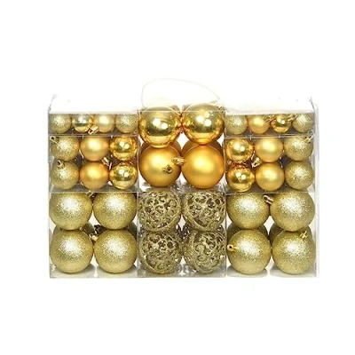 【Family Fun】: Lightweight and easy to hang, these bauble ornaments are suitable for all family members to join in the decoration process, spreading holiday cheer 【Eye-Catching Design】: An available gold colour and a shiny finish make this 100 Piece Christmas Ball Set impossible to miss. Adds a festive touch to any room in your home 【Christmas Decoration】: This set contains 100 beautiful Christmas balls in three different sizes, perfect for decorating your Christmas tree, home, or office 【Shatterproof Material】: Crafted of durable plastic that mimics glass, these Christmas ornaments are shatterproof and safe — perfect for homes with pets or children 【Includes Thread】: This set includes thread for hanging, making the process of decorating your Christmas tree simple and hassle-free