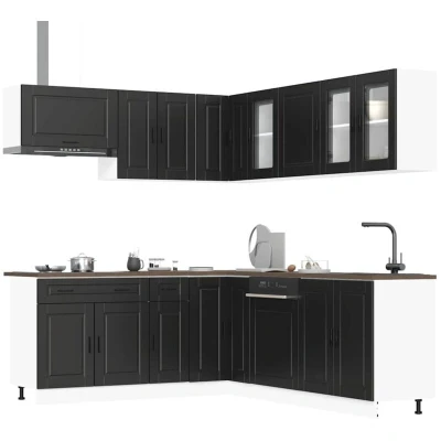 ManoManoGeneral description This 11-piece kitchen cabinet set features an elegant design that optimizes your kitchen space while providing ample storage for your personal belongings. Made from engineered wood, it is durable and stable, with a smooth surface that resists moisture, warping, and splitting. Technical specifications Colour: Black Material: Engineered wood and glass Range name: Porto Assembly required: Yes Delivery contains: 1 x Sink base cabinet: 80 x 46 x 81.5 cm (W x D x H) 1 x Kitchen base cabinet: 30 x 46 x 81.5 cm (W x D x H) 1 x Kitchen base cabinet: 80 x 46 x 81.5 cm (W x D x H) 1 x Kitchen wall cabinet: 50 x 31 x 60 cm (W x D x H) 1 x Kitchen wall cabinet: 60 x 31 x 60 cm (W x D x H) 1 x Kitchen corner base cabinet: 75.5 x 75.5 x 81.5 cm (W x D x H) 1 x Kitchen wall cabinet: 40 x 31 x 60 cm (W x D x H) 1 x Kitchen wall cabinet: 60 x 31 x 40 cm (W x D x H) 1 x Kitchen wall cabinet: 80 x 31 x 60 cm (W x D x H) 1 x Kitchen wall corner cabinet: 57 x 57 x 60 cm (W x D x H) 1 x