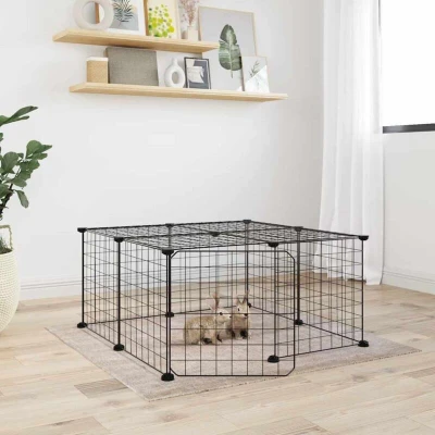 ManoManoGeneral description This trusty pet cage provides a spacious and safe enclosed space for your lovely pets to exercise, play, and rest. Made of sturdy powder-coated steel, this durable cage ensures years of use with minimal maintenance. The design features multiple panels, allowing you to assemble it into any shape and size you desire. With a practical door, it offers convenience for taking care of your pets. Technical specifications Colour: Black Material: Powder-coated steel Panel size (each): 35 x 35 cm (L x H) Grid height (each): 4.3 cm Delivery contains 12 x Panel 24 x Connector 12 x Floor protector 40 x Tie rib 2 x Door clip Other information