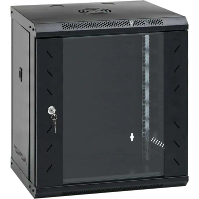 General description This 12U wall-mounted network cabinet is designed to efficiently organize your network accessories. It features a solid structure made of premium cold-rolled steel, ensuring durability and strength. The cabinet is compatible with 19" standard equipment and includes a lockable front door for added security. Technical specifications Colour: Black Material: Cold-rolled steel, glass Outer dimensions: 53 x 40 x 60 cm (L x W x H) Inner dimensions: 45 x 40 x 53 cm (L x W x H) Static loading capacity: 40 kg Degree of protection: IP20 Includes lock and key Lockable toughened glass front door Removable side panels Fan not included Compatibility and accessories Compatible with 19" standard equipment Installation Can be wall-mounted or placed on a table Usage Ideal for organizing network accessories and ensuring secure storage. Other information