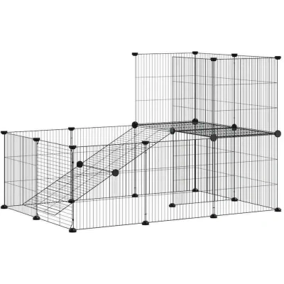 General description This trusty pet cage provides a spacious and safe enclosed space for your lovely pets to exercise, play, and rest. Made of sturdy powder-coated steel, this durable cage ensures years of use with minimal maintenance. The design features multiple panels, allowing for DIY assembly into any shape and size you desire. With a practical door, it offers convenience for taking care of your pets. Technical specifications Colour: Black Material: Powder-coated steel Panel size (each): 35 x 35 cm (L x H) Grid height (each): 1.5 cm Delivery contains: 20 x Panel 40 x Connector 20 x Floor protector 66 x Tie rib 2 x Door clip Other information Each product comes with an assembly manual in the box for easy assembly.
