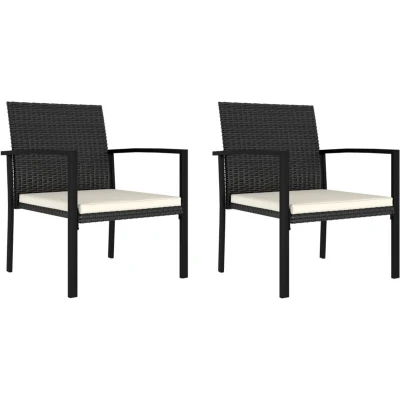 General description Add a touch of modern style with this garden dining chair set. Designed to complete an outdoor dining set or stand out on its own, this patio chair set makes an eye-catching statement in any setting. The sturdy steel frame wrapped with weather-resistant PE rattan ensures stability and durability, making it suitable for outdoor use. The included seat cushions provide additional comfort, and thanks to the lightweight construction, the chairs are easy to move around. Technical specifications Colour: Black Cushion colour: Cream Material: Poly rattan, powder-coated steel Cushion material: Fabric (100% polyester) Chair dimensions: 58.5 x 53 x 83 cm (W x D x H) Seat size: 47/41 x 45 cm (W x D) Seat height from the ground: 42 cm Armrest height from the ground: 61 cm Seat cushion thickness: 5 cm Max. loading capacity: 110 kg Assembly required: Yes Delivery contains: 2 x Dining chair, 2 x Seat cushion Other information Be aware of the risk of open fires and other sources of