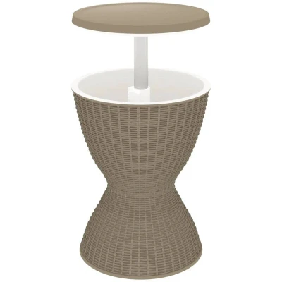 This ice cooler table is perfect for outdoor barbecues and parties. Additionally, it can be used as a cocktail table or coffee table, making it a versatile choice for multiple outdoor events. Durable material: Polypropylene (PP) is a popular plastic that is also one of the most used materials in outdoor furniture. It's lightweight, tough, and resistant to impact. Also, its resistance to UV rays and weathering makes it easy to clean and maintain.3-in-1 function: The table combines a cooler, a cocktail table, and a coffee table in one. The beverage cooler can be used as a coffee table when the tabletop is fully closed. When the tabletop is propped up 25 cm above the rim, the side table can be converted into a cocktail table with a cooler below.Imitation rattan look design: The bistro table features an imitation rattan design that adds a touch of natural charm to your outdoor living space.Built-in drainage plug & lock system: The outdoor cooler table has a drainage plug to facilitate emptying after use, and a simple rotate-and-lock system to keep the tabletop stable when extended. Note:To make sure your outdoor furniture stays beautiful, we recommend protecting it with a waterproof cover.