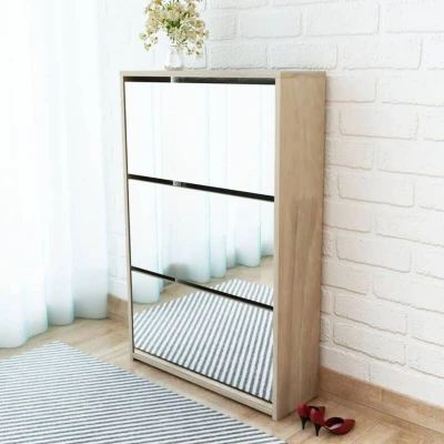 General description This modern, stylish mirrored shoe cabinet provides an ideal solution for keeping your room free from shoe clutter. The cabinet features three pull-down drawers, each capable of accommodating 3 to 4 pairs of shoes. It is designed to be mounted directly to the wall, ensuring a strong and durable storage option made from high-quality materials. Technical specifications Colour: Oak Material: Engineered wood + mirror Dimensions: 63 x 17 x 102.5 cm (W x D x H) 3 pull-down drawers Storage capacity: Approximately 9-12 pairs of shoes (depending on shoe size) Easy assembly Other information WARNING: To prevent overturning, this product must be used with the wall attachment device provided.