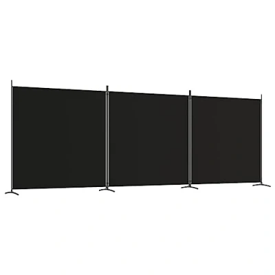 【Product Title 200】: 'vidaXL 3-Panel Room Divider in Black, Portable and Foldable Fabric Screen, Iron Frame, Versatile for Bedroom or Living Room, Blocks Sunlight - Overall Size 525x180 c 【Durability】: Made from 100% polyester fabric and iron for sturdy and durable use, this modern room divider will last for a long duration and maintain its appearance 【Sun Blocking】: This room divider screen can also be strategically placed near windows to block direct sunlight, making it a versatile addition to any room decor 【Privacy Protection】: The vidaXL 3-Panel Room Divider in Black Polyester Fabric serves as an effective room partition, providing privacy and creating separate spaces as needed within rooms 【Foldable and Portable】: The foldable design of this 3-panel room partition allows for easy storage and transportation without taking up much space 【Versatility】: Outstanding for separating areas in the bedroom or living room, or as a background wall and can also be used to block sunlight - proving to be functional in different scenarios