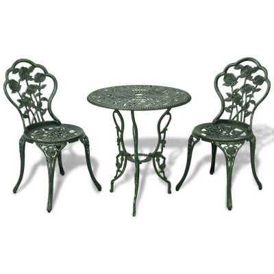 vidaXL 3 Piece Bistro Set in Green Cast Aluminium Outdoor Dining with Circular Table and Two Chairs Decorative Floral Pattern Durable, Weather Resistant Garden Furniture