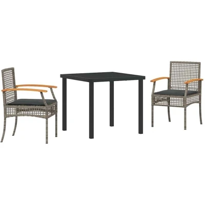 ManoManoGeneral description This Modern Garden Dining Set showcases sophistication with its clean lines and multifunctional design, making it an excellent fit for contemporary outdoor spaces. Crafted for summer gatherings in the garden or on the terrace, this set combines style with practicality, offering a warm welcome for outdoor dining and enjoyable moments. Its stylish appearance and minimalist approach complement any setting, whether hosting a party or enjoying a quiet dinner with family. Technical specifications Colour: Grey Material: Poly rattan Seat width: 46.5 cm Seat depth: 49 cm Max weight per seat: 110 kg Total max weight: 295 kg Assembly required: Yes Delivery contains: 2 x Garden chairs, 1 x Garden table EAN: 8721288657404 SKU: 3380820 Brand: vidaXL Convenience and Care Easy assembly requiring two people and a few tools. Care instructions recommend using a cover when not in use to protect the furniture from the weather. Materials are easy to maintain; a quick wipe-down keeps