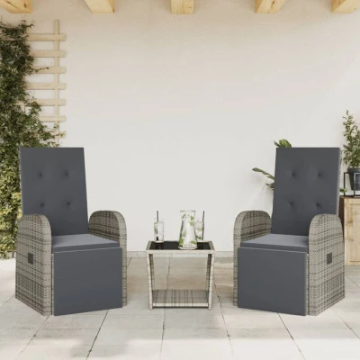 ManoManoGeneral description This garden dining set is an excellent choice for al fresco dining or simply relaxing in your garden, backyard, or on the patio. It features durable PE rattan, also known as poly rattan, which is a strong, low-maintenance synthetic material that resembles natural rattan. This lightweight material is easy to clean and is commonly used for outdoor furniture due to its durability and weather-resistant properties. Technical specifications Garden table: Colour: Grey and black Material: PE rattan, powder-coated steel, tempered glass Dimensions: 45 x 45 x 40 cm (L x W x H) Garden reclining chair: Colour: Grey Material: PE rattan, powder-coated steel Sitting dimensions: 57 x 69 x 106 cm (W x D x H) Lying down dimensions: 57 x 133 x 90 cm (W x D x H) Seat size: 47 x 50 cm (W x D) Seat height from the ground: 41 cm Armrest height from the ground: 63.5 cm Cushion: Colour: Dark grey Cover material: Fabric (100% polyester) Cushion thickness: 4 cm Maximum load capacity (per