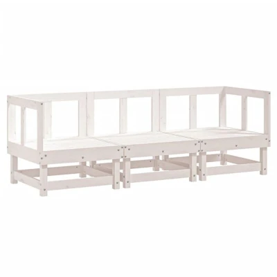 General description This wooden garden lounge set with a slatted design is a perfect addition to your garden, patio, or terrace, allowing you to enjoy cozy moments with family and friends. Made from solid pine wood, it features a beautiful natural finish and a rustic look, enhanced by its straight grain and unique knots. Technical specifications Material: Solid pine wood Colour: White Overall dimensions: 183 x 61 x 62 cm (W x D x H) Garden corner sofa dimensions (each): 61 x 61 x 62 cm (W x D x H) Garden middle sofa dimensions: 61 x 60.5 x 62 cm (W x D x H) Seat size (each): 60 x 60 cm (W x D) Maximum load capacity (per seat): 110 kg Assembly required: Yes Compatibility and accessories Delivery contains: 2 x Garden corner sofa, 1 x Garden middle sofa Cushions are not included Usage The lounge set is designed for daily outdoor use, providing a sturdy and stable seating experience. The backrest and armrest enhance comfort, making it ideal for relaxation. Its modular design allows for
