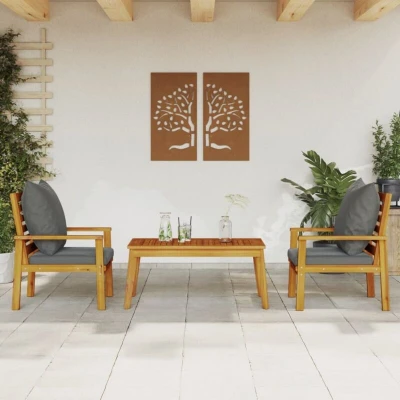 VidaXLThis wooden garden lounge set has an elegant design and is a great choice for relaxing and enjoying in the garden or patio. Solid acacia wood: The outdoor lounge set is made of solid acacia wood for sturdiness and stability. Solid acacia wood is a beautiful natural material. Acacia wood has beautiful wood grains make every piece of furniture unique and slightly different from each other.Comfortable seating experience: Featuring armrests and a backrest, the patio lounge set gives you the utmost comfort. Also, the thickly padded cushions provide comfort for your sitting time.Stable and easy-to-clean tabletop: This garden table has an acacia wood top that is sturdy, durable, and easy to clean with a damp cloth.Wide applications: The garden seating is perfect for any front porch, patio, backyard, lawn, garden, etc. Good to know:To make sure your outdoor furniture stays beautiful, we recommend protecting it with a waterproof cover.